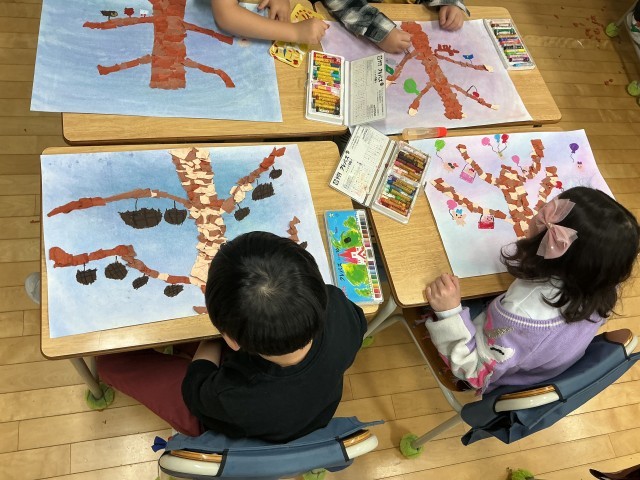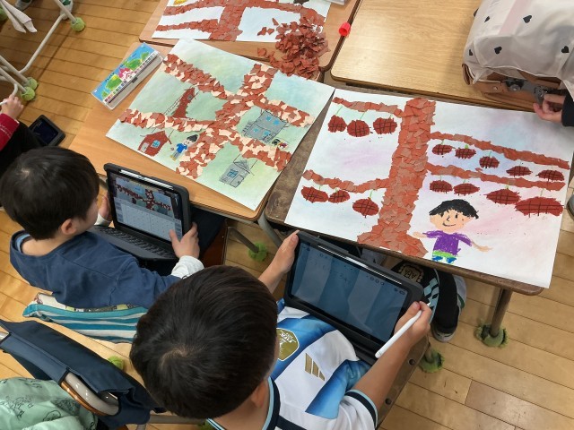 2年生の教室では、前回お伝えした図工「ふしぎなタネやさん」の続きの作業中。この間見た時には、木の幹と枝を作っているところでした。今日見てみるとみんな進化しています。木にステーキがなっていたり、枝に家がついていたり、美味しそうないろいろなフルーツがなっていたり、プレゼントがたくさんついていたり・・・とそれぞれの子どもたちの思いから、タネから不思議な木が成長しました。