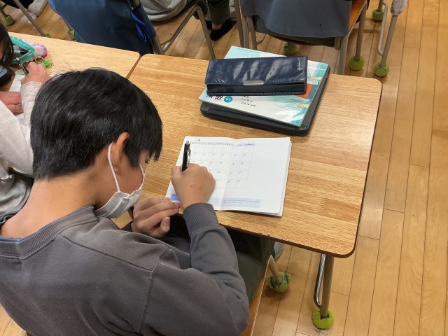 5年生は、何やら手帳に日付を記入しています。無料でいただける手帳を入手し、子どもたちが1月から手帳を活用するよう準備中。・・・というのも、今年の5年生の宿題は、日々出されるのではなく1週間まとめて出されています。スケジュールを自己管理して期限までには提出できるように・・・というシステムで行っています。現状でも多くの子がスケジュール管理ができているのですが、中には溜めこんでしまい困ってい子もちらほら。そこで、すでにできている子はさらに安定的に、そうでない子はこの手帳を活用して自己管理していけるようにとの取り組みです。まずは、1〜3月の日付を記入、続いて始業式などの予定を入れていきます。もちろん誕生日やお出かけの予定などの記入もOK。5年生もあと3ヶ月で最上級生。自己管理のできる人になっていってほしいですね。