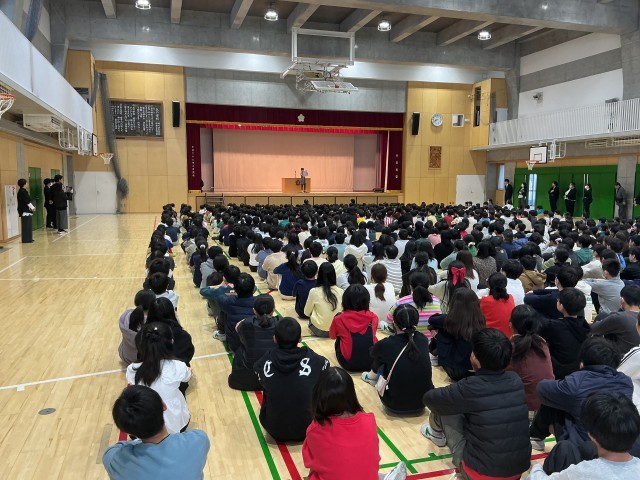 登校後、朝の時間から1時間目前半までは、全校体育館に入って終業式です。