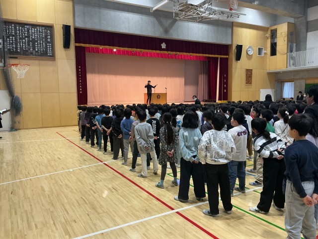 式後、生活指導主任から冬休みの過ごし方についての話。交通事故に遭わないように気をつけること、繁華街などに子どもだけで行かないことなどを確認しました。
