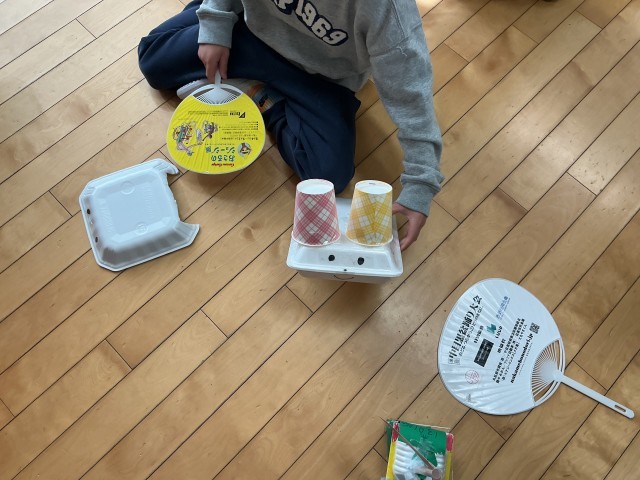 1年生の図工の時間、食品トレーや紙コップ、カップ麺のカップなど軽くて切りやすい素材でできたものを使って「ふわっふわっゴー」を作りました。うちわで扇いで風を送って進むものです。