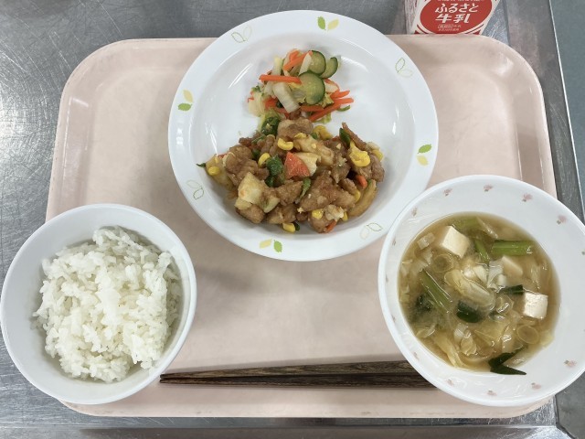とり肉とコーンの揚げ煮は、鶏肉やじゃがいも、にんじん、ピーマン、コーンを入れて作りました。とり肉とじゃがいもを油で揚げて、ゆでておいた他の野菜と合わせた後に甘辛いたれを絡めました。