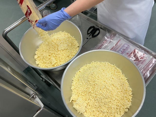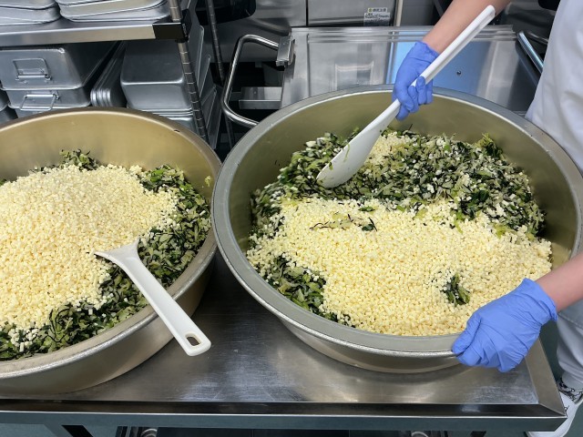 今日の鉄骨サラダには、血液を作るもとになる「鉄分」や「骨」を作るもとになるカルシウムが多い小松菜やひじき、チーズが入っています。小さな角切りのチーズを入れることで、チーズの風味や食感によりふだんとはちがった味わいのサラダになります。しっかり食べて健康な体をつくりましょう。