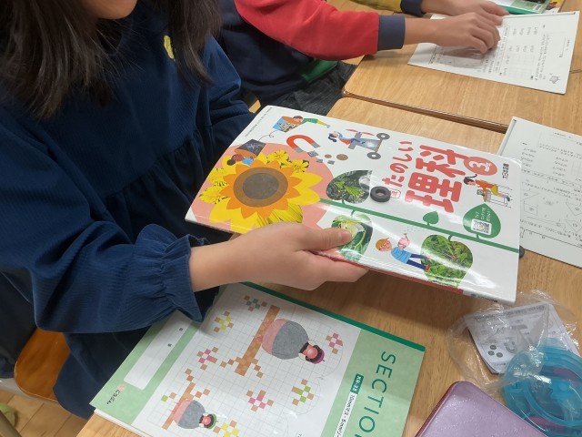 2枚目の写真の子は、磁石と磁石の間に教科書を挟んでも、下の磁石を動かすと上の磁石も同じ動きをするということに気付きます。これも「磁石と磁石が直接触れていないのに連動して動いている。どうしてだろう?」と疑問が生まれます。