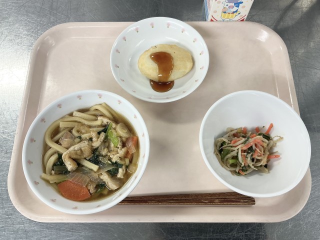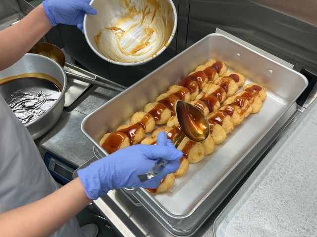 じゃがいももちは、蒸したじゃがいもをつぶして塩こしょう、片栗粉を入れてよくこねて、丸く形をととのえて油で揚げました。独特のもっちりとした食感が美味しく、甘辛い味のたれとよく合います。