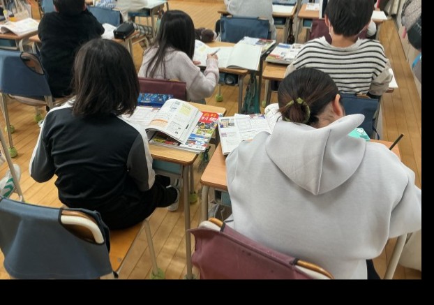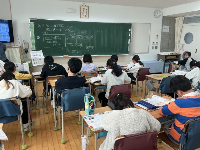 5年生の教室は、社会の時間でした。学習しているのは「情報」。今日は、その中でも商店などにおける情報についての学習をしていました。