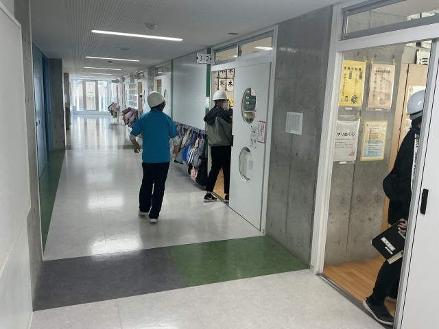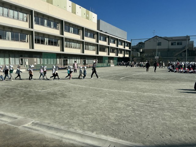 今日は2月の避難訓練の日。今回の想定は、地震発生のあと職員室から出火、火災も起きたという想定です。しかも、予告なしで放送機器も途中で使えなくなったという難しい想定です。