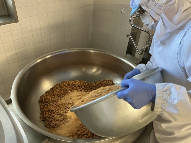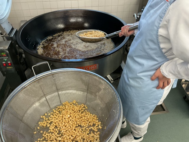 きなこ大豆は、大豆に片栗粉をまぶして油でカラッと揚げた後、さとうで作ったシロップを絡め、きなこをまぶしました。材料はシンプルですが、ほど良い甘さときなこの風味で美味しく食べられます。