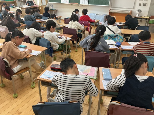 1年生の教室では、漢字の学習をしていました。学年が始まってしばらくはひらがな、カタカナの学習でしたが、1年生も終盤に差し掛かった今は、漢字の学習です。そういえば、登校してくる時、学習中など、いつの間にか顔つきが変わってきていて、どこかキリッと頼もしくなってきています。