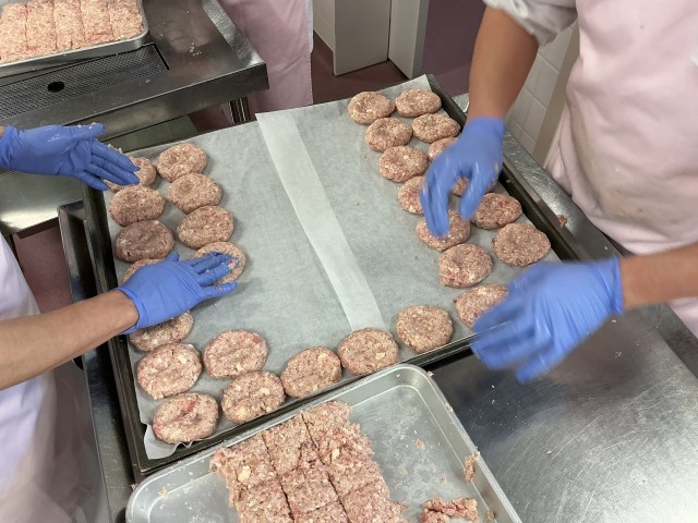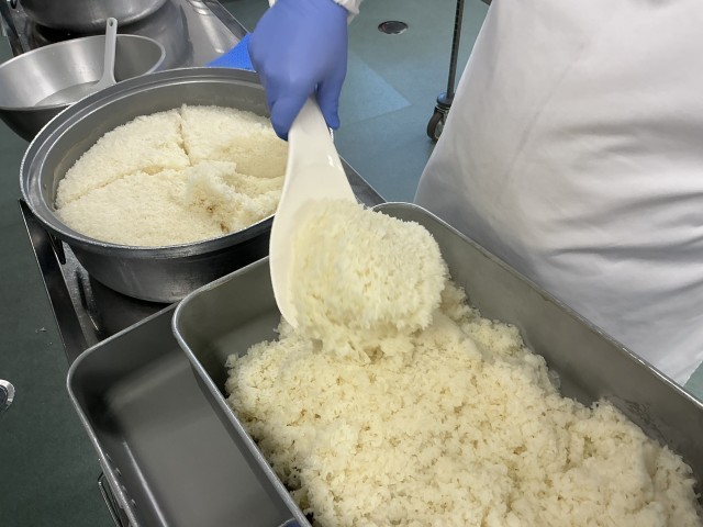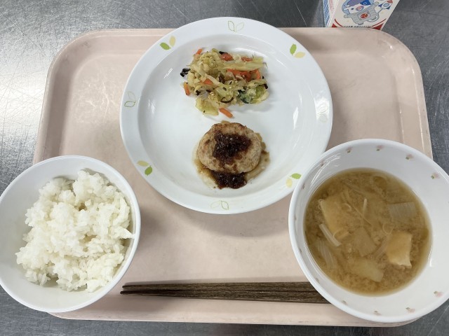 今日のハンバーグは、豚ひき肉や玉ねぎのほかに豆腐を入れて作りました。豆腐を入れることで、ふんわりと柔らかい食感になります。ハンバーグには、炒めた玉ねぎが入った和風のたれをかけました。また、今日は月に一度の有機米の日でした。今年度食べることができるのは、今日と3月のあと2回です。生産量の少ない貴重なお米なので、ぜひ味わって食べてください。