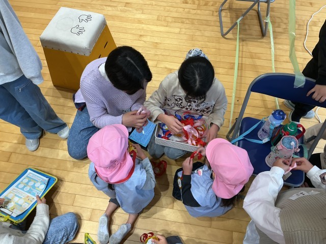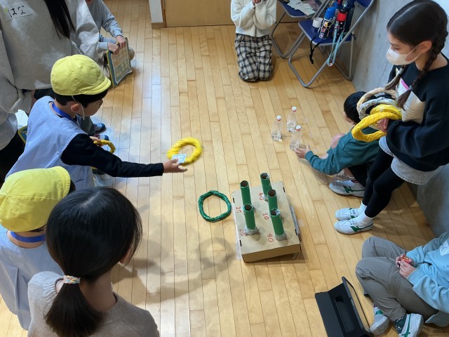 ここの3枚の写真は、前半のお楽しみコーナー。輪投げやクイズなどまずは楽しんでもらうことからスタートです。