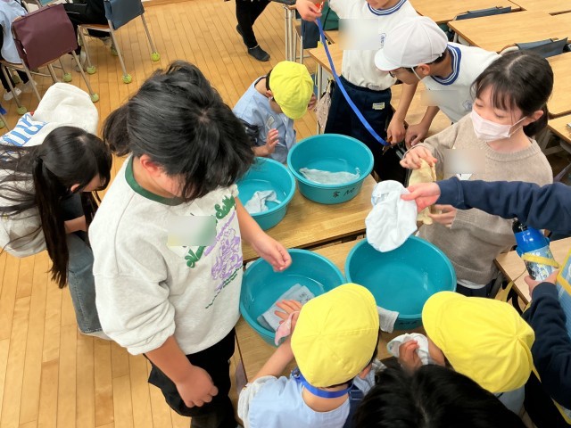 小学校では学習もしますよということで、あいうえお50音表で一部を隠して隠れている文字を当てるクイズ。担当の5年生も雰囲気を盛り上げながら楽しく遊びながらのクイズになりました。また別のグループは雑巾しぼり体験コーナー。掃除の時間に使う雑巾をしぼる練習です。そしてそのすぐそばでは、給食配膳体験。給食当番を体験する子と給食をもらう側の練習。ご飯やおかずは紙などで作ったものです。そしてスープの代わりに水を配膳。運ぶのに少し緊張感がただよいます。