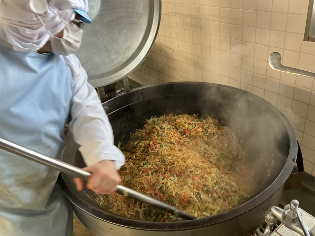 ソース焼きそばは、キャベツやもやしなどたっぷりの野菜と麺、調味料を炒め合わせて作ります。野菜や麺を合わせると200kg近くになり、給食室の釜で一度に炒めるのが難しいため、4回に分けて炒めています。また、今日のデザートはりんごです。果汁たっぷりで、甘くてシャキシャキした歯応えが美味しいりんごでした。