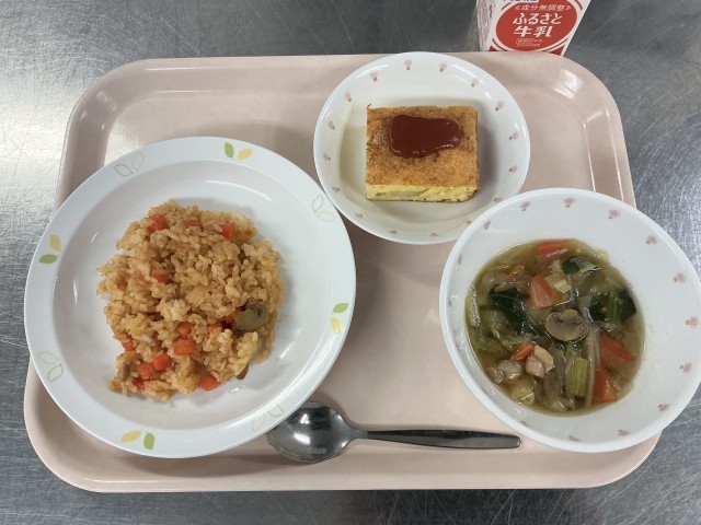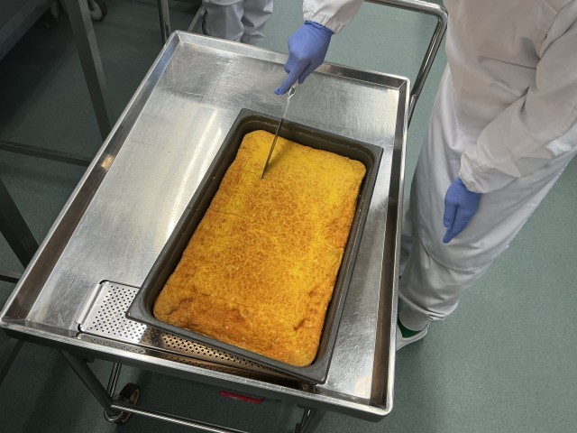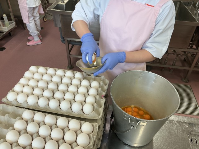 今日のチーズ入りオムレツなど、給食のオムレツにはたくさんの卵を使います。今日も700個くらい卵を使いましたが、調理員さんが片手で手早く、殻などの混入がないように確認しながら割ってくださいました。