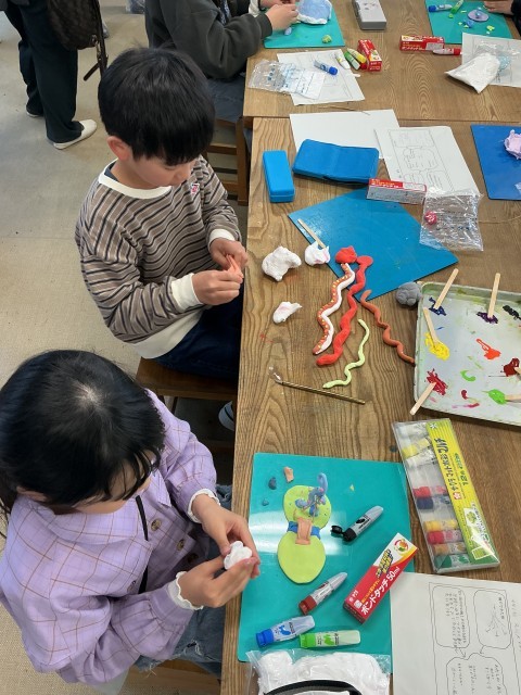 図工室では、「風をつかまえて」。自分の表したい風を材料などを工夫して表すというものです。授業に先駆けて布などを風に当てて、どのような形になり、動きをするのかを試してみました。そして、自分なりにどんな風なのかを考え、主に紙粘土を使ってオリジナルな風を感じる造形活動をしていました。