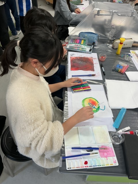 理科室では、「見つけたきっかけを えらんだ方法で もっとすてきにしよう」。絵の具や水性ペン、油性ペン、ボンドなどを使って素敵な模様を作っていきます。綿棒にモールで手や足をつけ、顔を描いたオリジナルの「ペン」を使って、また、筆や指なども使って模様を描いたり、色を滲ませてみたりと思い思いに描いていました。