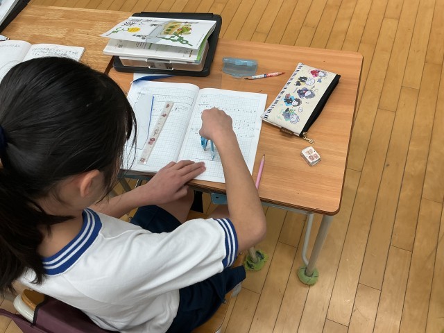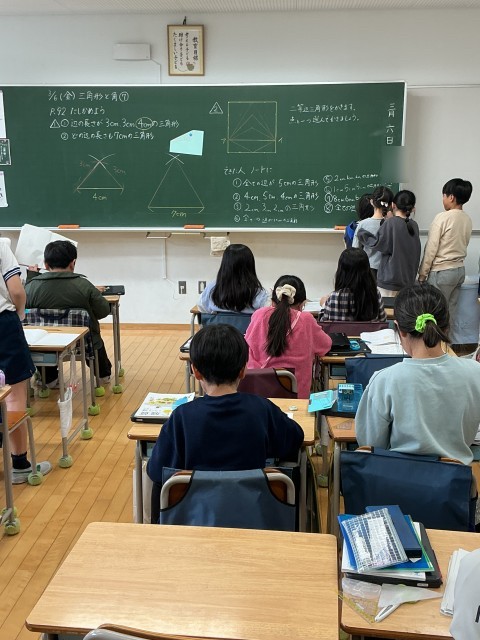 「そろばんがいいな」「なかなか上手くかけない・・・」「見て見て!上手くかけたよ」と子どもたちのつぶやきがいくつか聞こえてきました。3年生は、図形・三角形の学習中。