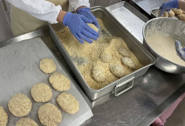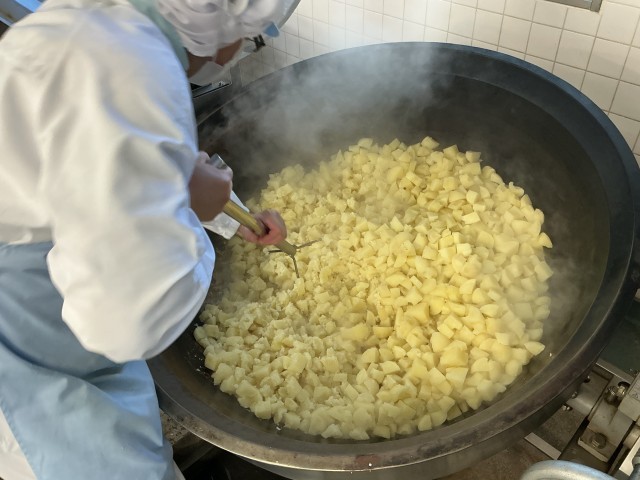 ポテトコロッケは、今日は55kgのじゃがいもを使って作りました。たくさんのじゃがいもをつぶす作業はとても力が必要です。つぶしたじゃがいもは、玉ねぎやにんじんと合わせて味付けし、1つ1つ丸めてパン粉をつけて油で揚げました。調理員さんが850個のコロッケを手際よく作ってくださいました。