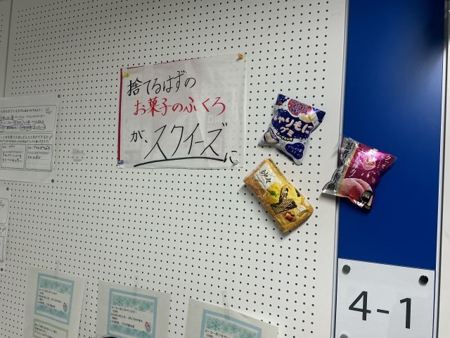 そして3枚目は、「スクイーズ」。捨てるはずのお菓子の袋や箱の中に詰め物をして、ぷにぷにの感触を楽しむものです。私も触らせてもらいましたが、まさに「ぷにぷに」。お菓子の箱で作ってあるということは「硬い」のかなと予想していましたが、ちょっとクセになりそうな感触。