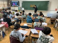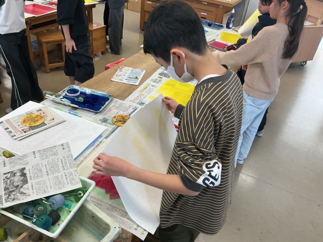 図工室では、5年生が「すって かさねて」をしていました。漢字を当てると「刷って 重ねて」でしょうか?バレンで擦るので「擦って 重ねて」かもしれませんが・・・。