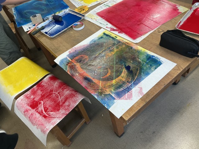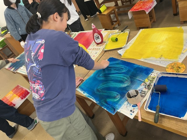 「プラダン」ってご存知でしょうか?コロナの頃、衝立として使ったりしていたプラスチック系の素材でできたダンボールのような断面形状のものです。このプラダンに絵の具をのせ、そこにさまざまなもので模様などを描き、版画の要領で紙に写しとっていきます。使える色は3色。5,6色用意されているところから3色をチョイスします。そして、浮世絵と同じように薄い色から刷っていって、色を重ねていきます。薄い色から刷っていくのがセオリーです。