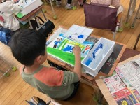 それぞれの子どもの色のチョイス、どんな模様を付けるのか、何で模様を付けるのか工夫のしどころです。厚紙を使ったり、フォークを使ったりと道具も様々。単純なようでいて、それぞれ個性的な作品が刷り上がってきていました。