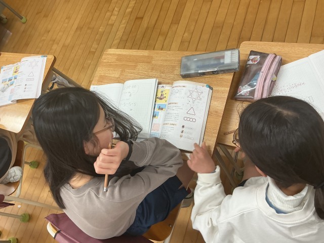 6年生は、これまで学習したことの総復習。算数の教科書の最後の方にちょっとクイズやパズル的な要素もある頭の体操的な問題のページがあります。その問題を解こうとみんな頭を捻っています。ずっと考えている時のモヤモヤ感、そして解けたときのスッキリ感。まさに子どもたちの様子がそんな感じで、まだ解けていない子は「うーん」と唸っていたり、片肘ついて考える人になっていたり。さらに教科書の問題が終わったクラスでは、こんな問題に取り組み唸っていました。