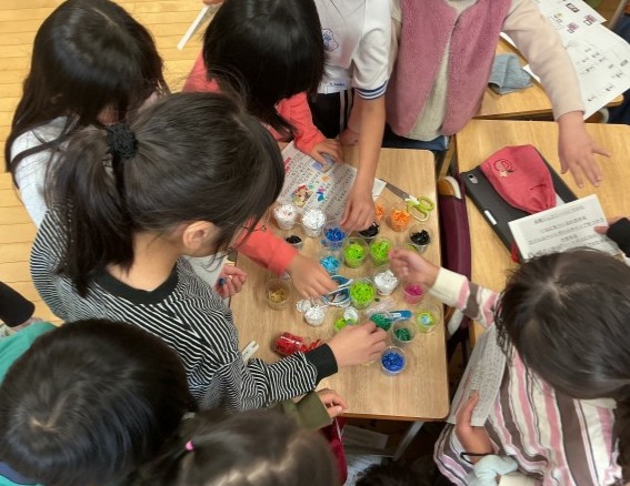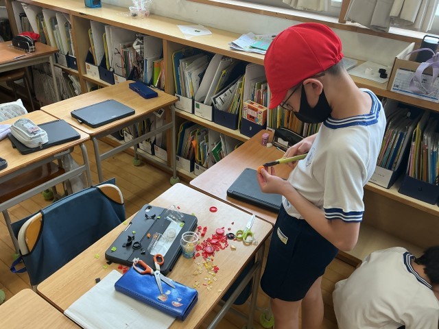 今日から19日までの中休み、こちらのクラスでは「SDGsで変えていこう、私たちの未来」の取り組みの一つとして、捨てるはずのペットボトルキャップを使って、「多聞ジュエリー」作りを、他の学年の子どもたちに楽しみながらSDGsを学んでもらおうと開催しています。