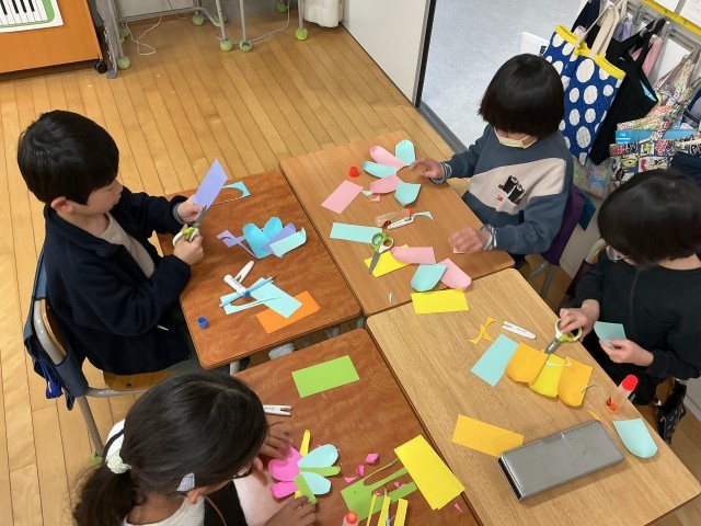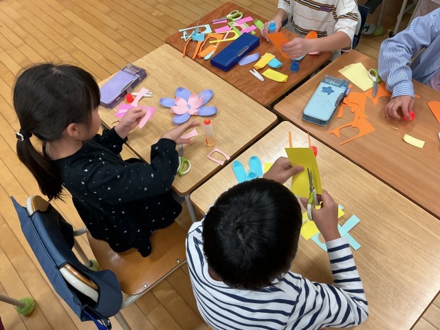 まるでクラフトばさみで切ったのかと思ってしまうようほど縁をギザギザにした子や、先端に切れ込みを入れて重ねてとめることで立体的な花びらにした子、花びらを二重に配置して立体感を出した子など工夫はさまざま。楽しそうに花を作っていました。