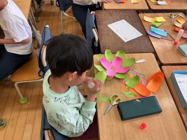 あるクラスでは、花を作っている子の中から鼻歌のように「世界に一つだけの花」が聞こえてきました。それがだんだん波紋のように周りに広がっていき、クラスみんなで口ずさんでいました。ちょっとほっこりする一幕でした。