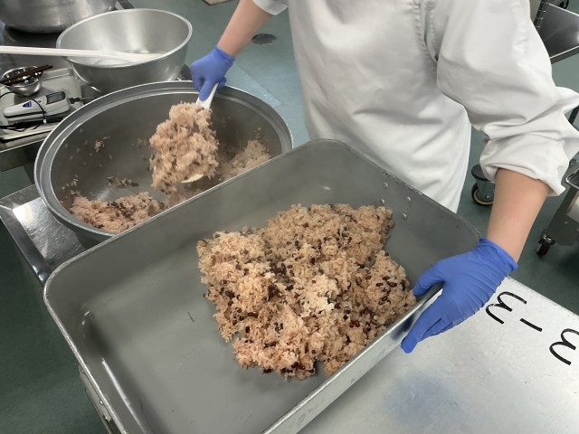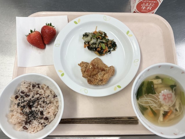 今日は、6年生の卒業と1年生から5年生の進級のお祝い給食です。お祝いの時によく食べられる赤飯と、「祝」の字が入ったなるとを入れたすまし汁を作りました。1年間の給食時間を振り返りながら味わって食べてください。今日は今年度の給食最終日です。1年間ありがとうございました。