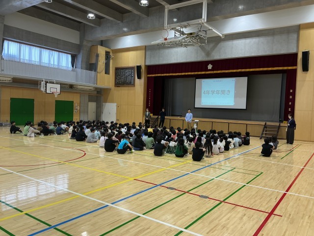4年生は、体育館で学年集会。まずは学年で集まって、学年全体でのスタートです。この後、各教室で学級開きが行われます。