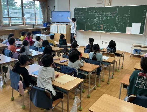 3年生の教室では、転任してきた先生のクラスだったため、まずは先生の自己紹介。子どもたちも「どんな先生なんだろう」と興味津々。