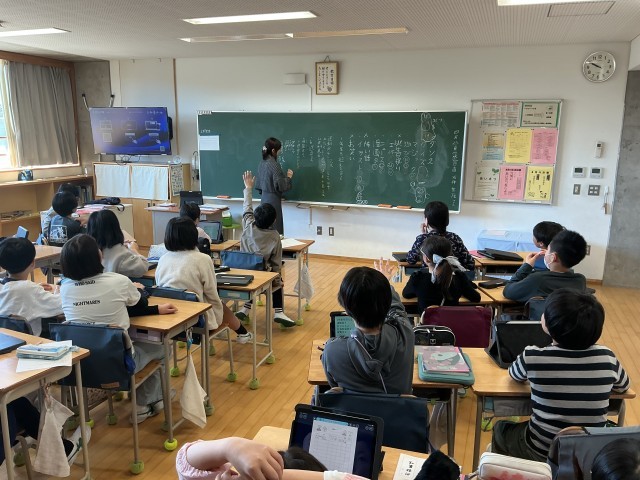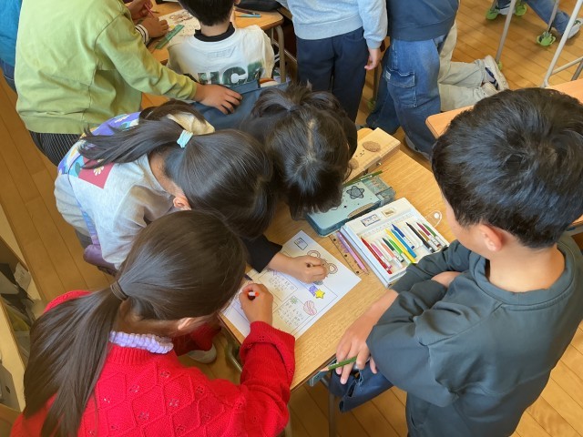さらにいくつかの教室で行われていたのは、運動会関係。先ほどの実行委員決めに加えて、スローガンのクラスとしての案。入れたいワードを挙げ、絞っていきます。加えて、運動会プログラムの挿絵の募集がかかっており、挿絵を描いている姿も見られました。