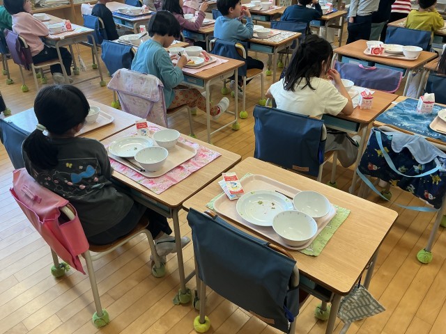 今日のの献立は、わかめとじゃこのご飯、豚汁、ふくさたまご、いちご、牛乳でした。写真を撮りに行ったのが少し遅かったので子どもたちはほぼほぼ食べ終わってしまっていました。献立については、HPに「今日の給食」としてあげられると思いますのでそちらをご覧ください。