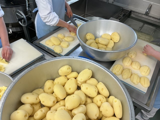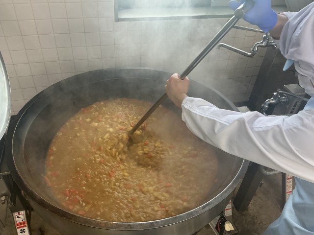 今日は多聞小学校特製のカレーです。玉ねぎはじっくり炒めて甘みを出し、鶏肉やにんじん、じゃがいもをたっぷり入れて、コトコト煮込みました。