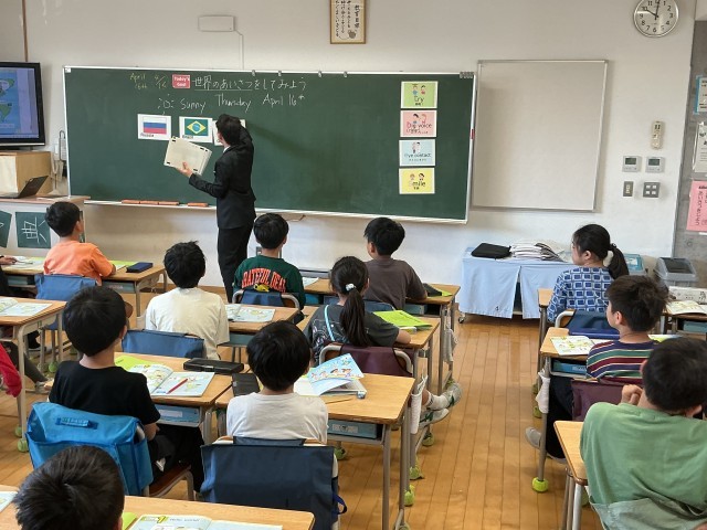 次は外国語活動。外国語担当の先生も、ALTの先生も代わって気持ちも新たに始まりました。今日は、世界各国の挨拶について。言葉の違いはもちろん、お辞儀だったり、握手だったり挨拶するときの習慣の違いについても考えていました。