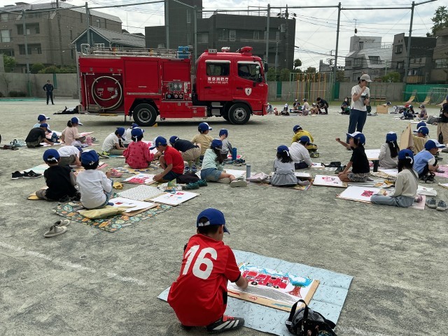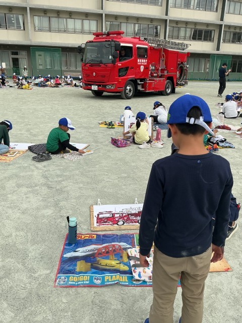 今日は2年生の消防写生会。消防署の方がポンプ車とともに多聞小に来てくださいました。