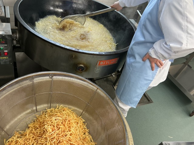 じゃがいものハニーサラダは、ドレッシングにはちみつが入っています。はちみつの風味が、カリカリに揚げたポテトによく合います。ポテトと一緒に野菜もしっかり食べてもらえると嬉しいです。
