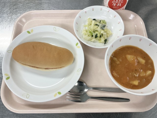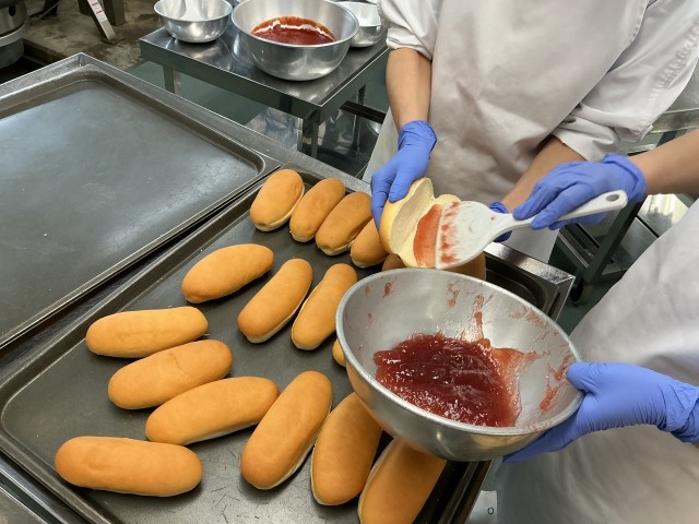 いちごジャムサンドは、切り込みを入れたコッペパンに1つ1ついちごジャムを塗りました。
