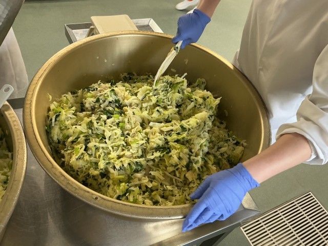 グリーンサラダには、今が旬のアスパラガスが入っています。食べやすいように、薄くスライスして入れました。旬の味を味わってください。
