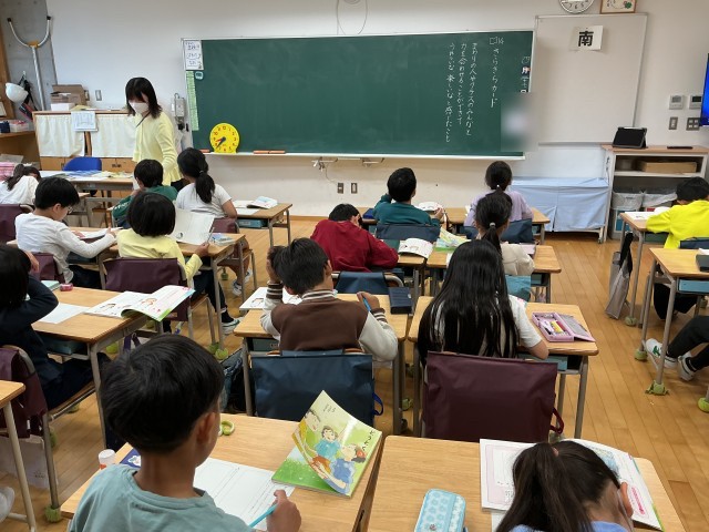 これは、交換授業の一コマ。学年の先生が、違うクラスの道徳の授業を行なっています。1,2年生でも交換授業を、4〜6年生は、教科によって担当が変わる一部教科担任制を実施しています。そのほか音楽や図工など学年によって専科の授業があります。