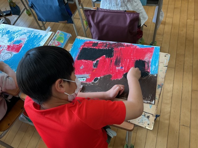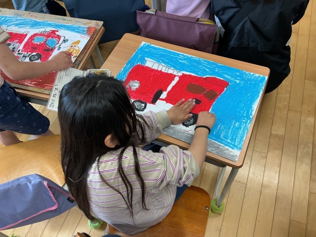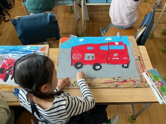 今日はその仕上げの日。先日見た消防車を思い出しながら、分からないところは友達から情報収集をしながら隅々まで仕上げていきます。クレパスで手を真っ黒(真っ赤?)にしながらしっかりと描いていました。消防車の絵ももうすぐ完成です。