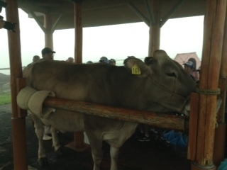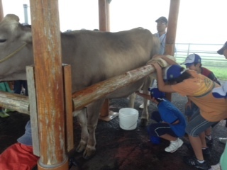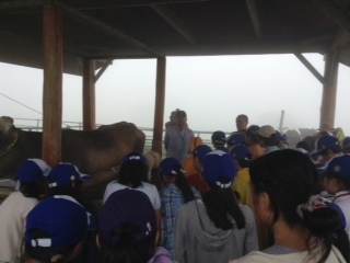 霧の、というか雨の大笹牧場。搾乳体験をしました。遊んで昼食の予定でしたが、悪天候のため宿舎で昼食となります。