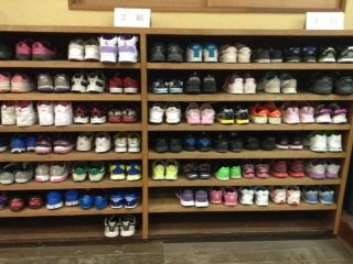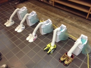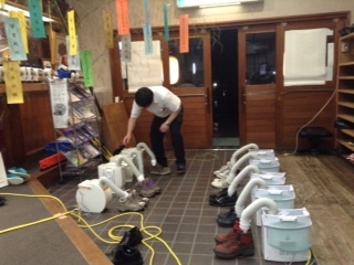 雨でびちょびちょになってしまった靴。宿舎の新兵器「靴乾燥機」でしっかりと乾かしていただきました。東観荘さんありがとう。