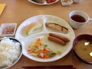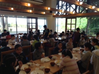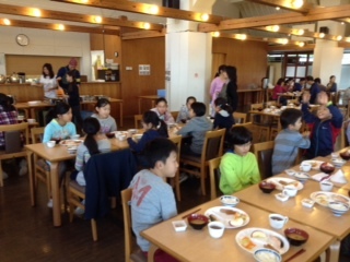 朝食。みんなお腹が空いているのでよく食べています。川場の新鮮なリンゴがおいしい。