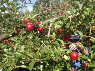 りんご狩り。真っ赤なりんごをふたつ、自分でもぎました。リンゴの試食とジュース、美味しかったです。