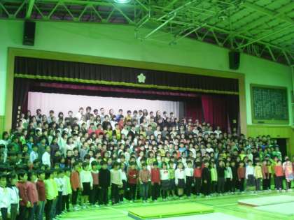 多聞小学校は、全校児童がステージにならび