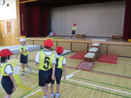 だんだん高くなっていく跳び箱が3つつながっているところを上がっていくコーナー、