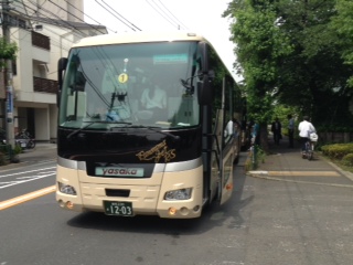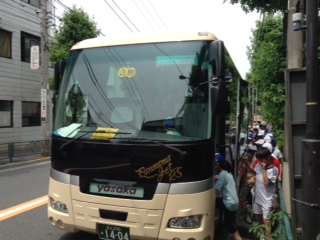 バスに乗って、梅丘中学校の温水プールへ出かけます。